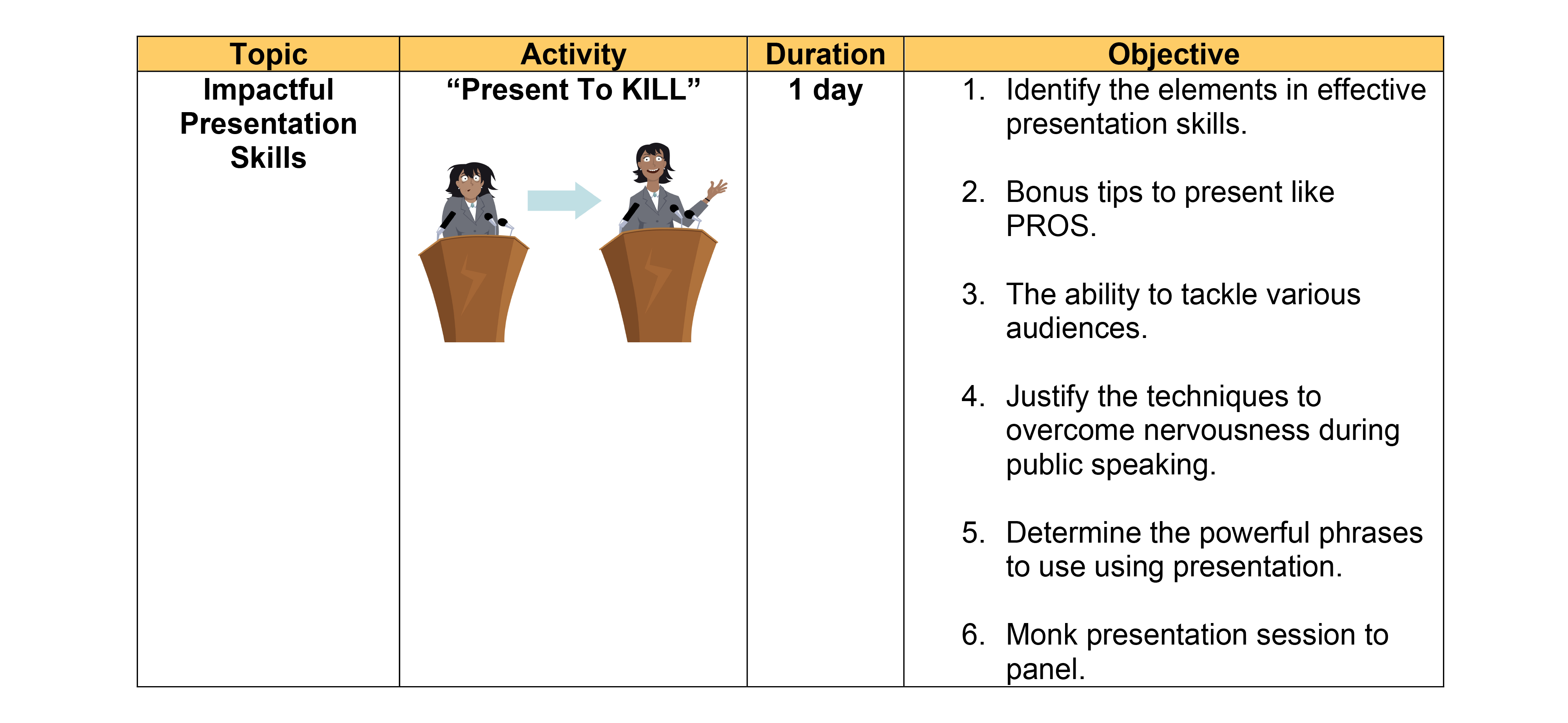 Identify impactful presentation skills at the workplace.