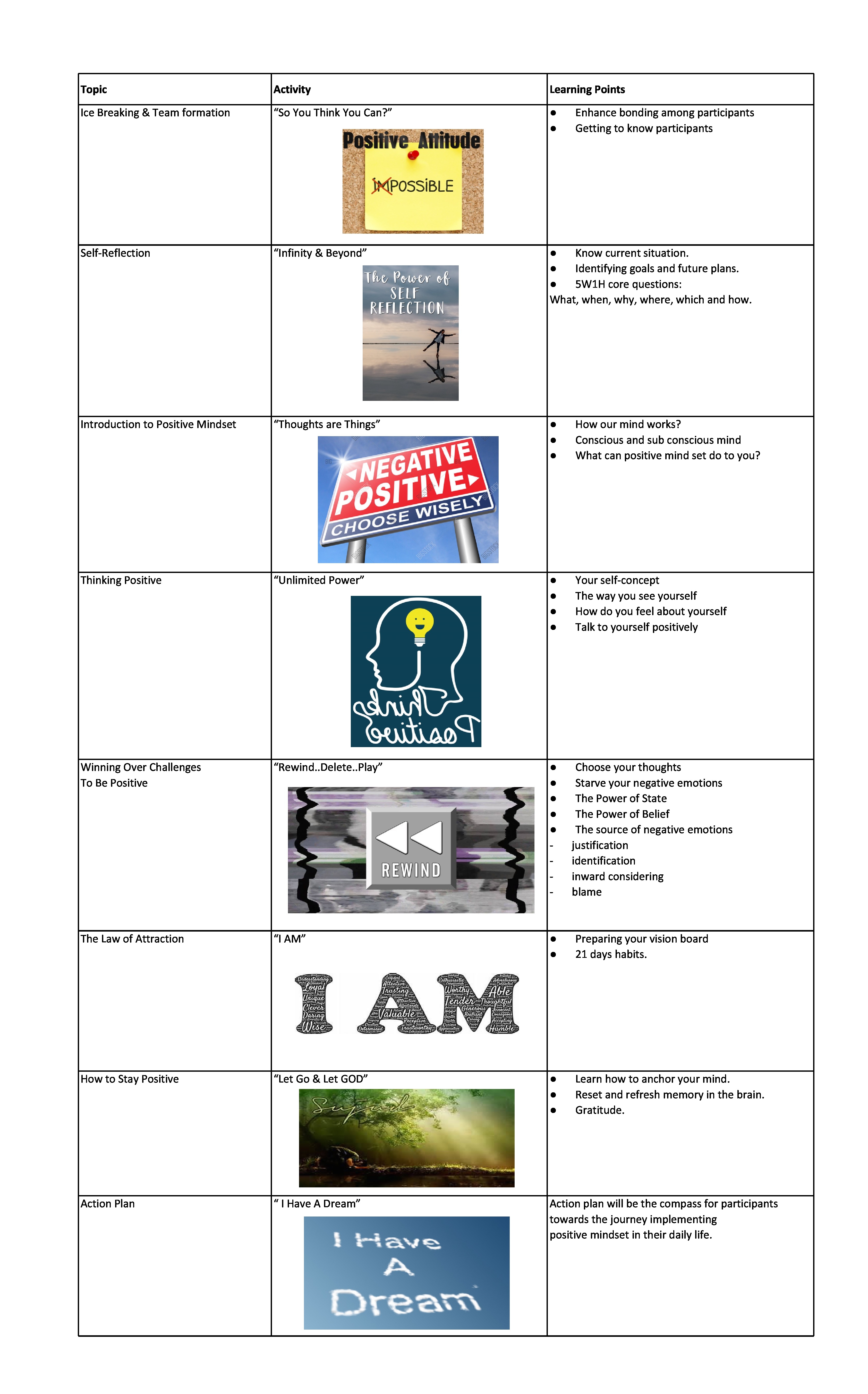 This program will focus on the importance and core elements of positive mindset. The ability to control and shape our mind to be positive will enhance our achievement at work and personal life.